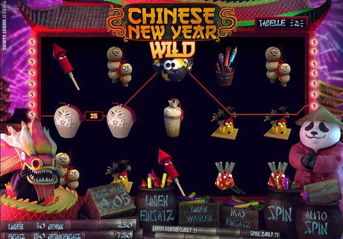 Beide dieser Dinge werden im SunMaker Spielautomat Chinese New Year verbunden. Und dieser online Slot bietet dann noch mehr. Denn er hat eine wirklich unglaubliche Grafik. Kein Wunder, ist er doch in der Full HD Technologie erstellt. Und das sieht man auch an jeder Kleinigkeit. Wo man bei anderen Spielautomaten, selbst bei so gut gemachten Merkur Slots, kaum klare Übergänge zwischen einigen Farben sieht, erkennt man hier fast jedes Härchen des Pandas und natürlich jedes Detail der Gewinnsymbole.