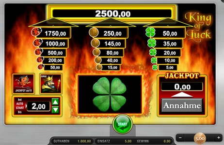 Hier musst du wirklich versuchen das richtige Mittelmaß zu finden. Denn je länger du wartest mit dem Auszahlen, desto mehr Geld kannst du zwar gewinnen, aber desto höher steigt auch die Chance, dass du alles verlierst. Neben dem King of Luck als Joker gibt es nämlich auch noch das Teufelchen als Niete in diesem online Slot von Merkur. Taucht dieser nämlich auf, dann wird der Jackpot auf Null gesetzt. Hast du vorher nicht ausgecasht, dann sind diese Gewinne alle weg.