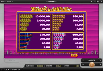 Beim Video Spielautomaten Spiel Wags to Riches handelt es sich um einen 5 Walzen Spielautomaten mit 20 Gewinnlinien oder auch Paylines genannt. Vor jedem Spin kann man seinen Einsatz festlegen, der je nach Risikobereitschaft zwischen 0,01 € und 1 € pro Gewinnlinie liegen kann. So kannst Du bei vollem Risiko bis zu 20 € in Wags to Riches setzen. Man sollte am Anfang jedoch Wags to Riches mit mittelmäßiges Risiko spielen um so zu vermeiden, dass nach wenigen Spins der Einsatz weg ist, denn Wags to Riches Walzen drehen sich schnell und je nach Glück springen sagenhafte Gewinne heraus oder eben nicht. Teste daher Wags to Riches erst einmal im Funmodus. Wie das geht?