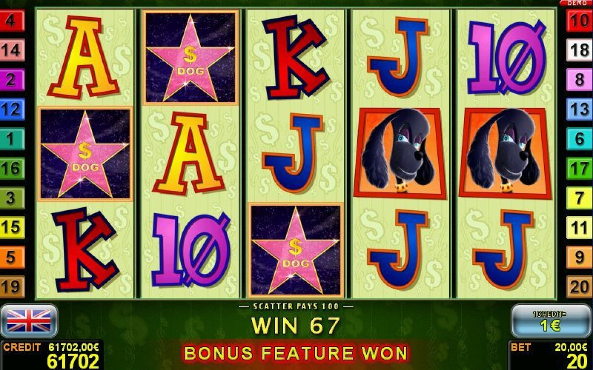 Dollar Dogs ist ein ganz normaler Novoline Slot. Er hat fünf Walzen und du kannst bis zu 20 Gewinnlinien aktivieren. Die Symbole sind dann die bekannten und auch in anderen Novoline Spielautomaten bekannten Kartensymbole, drei Hundehalter und drei Hunde. Sowie natürlich die Medaille als Wild und der Stern als Scatter.