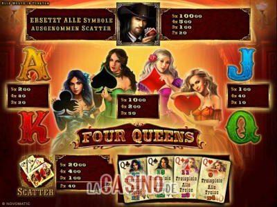 Natürlich geht es beim Novoline Spiel Four Queens um vier Königinnen, das besagt ja schon der Name des Spiels. Aber könnt ihr auch erraten, um welche vier Queens es geht? Genau, um die aus dem Kartenspiel – Herz, Karo, Pik und Kreuz. Du darfst dich bei diesem Spiel auch wieder auf viele zusätzliche Gewinnmöglichkeiten freuen. Die vier Königinnen, bald hoffentlich auch online zu spielen, haben einige Überraschungen für dich!